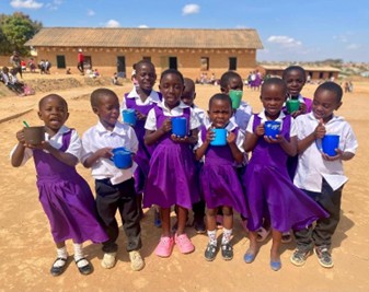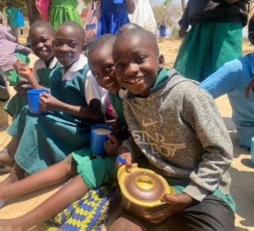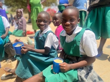 よく晴れた金曜日、カゾンバ小学校では、児童たちがポリッジ(お粥)のカップを手に集まり、笑い声と歓声が響き渡っていました。