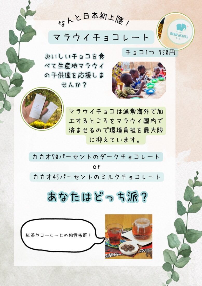 会場では、マラウイの子どもたちの学校給食を支援する取り組みとして、マラウイ産の紅茶・コーヒー・チョコレートが販売されました。特に今回の目玉となったのは、マラウイ産チョコレートの日本初販売。アフリカ南部の小さな農村で丁寧に作られたチョコレートは、訪れた多くの方に温かい驚きをもたらしました。