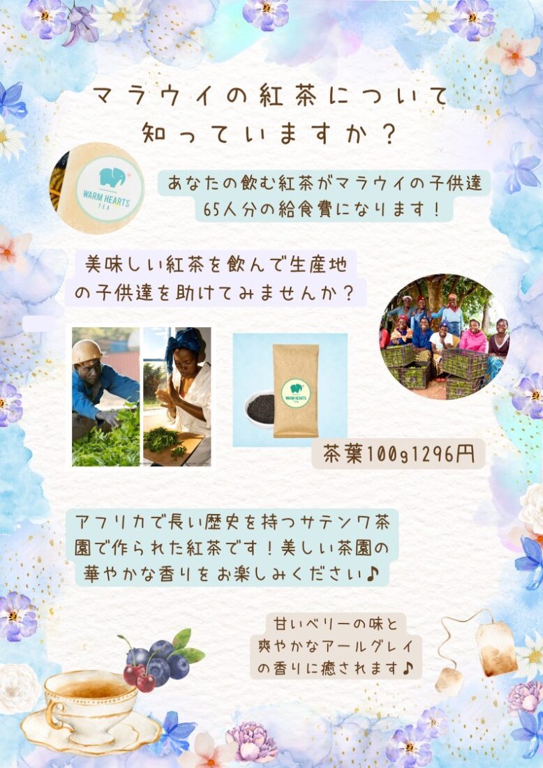 紅茶とコーヒーは、NPO法人せいぼが運営する「Warm Hearts Coffee Club」より提供されたもので、売上の一部がマラウイの学校給食支援に活用されます。参加した地域の子どもたちは、販売ブースの運営や呼びかけ、来場者への説明を通して、フェアトレードや社会貢献について学びながら実践しました。