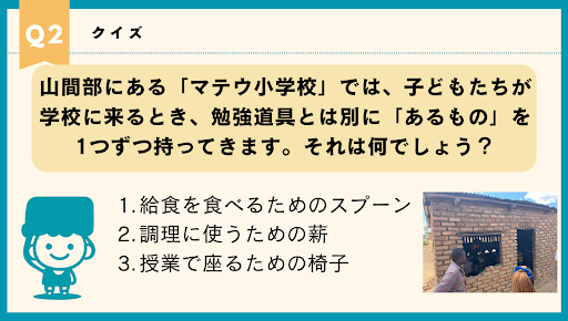 イベントの初めには、2025年10月末にマラウイに渡航したせいぼスタッフから渡航報告をクイズとともに行いました。マラウイでの食事や、現地で訪れた学校について写真を使いながら報告をしました。