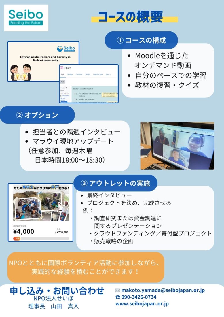 本プロジェクトでは、Moodle研究者、大学での実践者、せいぼの学生スタッフ、職員、海外大学からの来ている学生インターンがチームとなり、せいぼが実施する給食支援の意義、NPOの価値と学生との連携の方法、ビジネスの事例と貧困課題を段階的に学べるMoodleコースを共同開発しました。